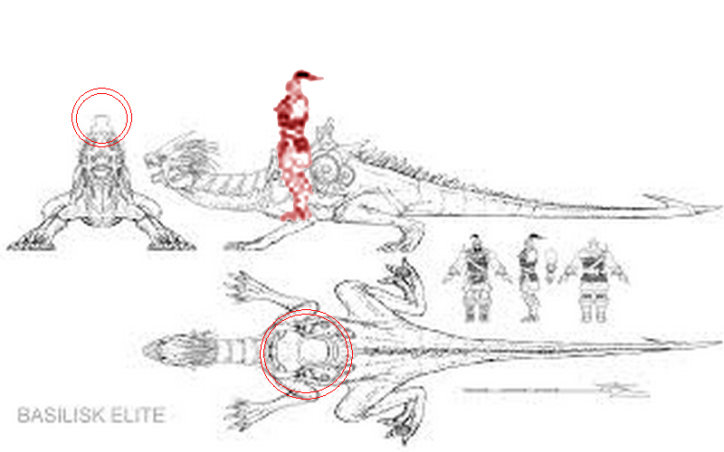 Насколько мне известно, это на самом деле юнит. Но меня тоже смущали пропорции василиска и орка, поэтому я стал внимательнее разглядывать рисунок и похоже, что разглядел седло (в красных кружках), соответственно ездок должен быть примерно такого размера или даже больше: