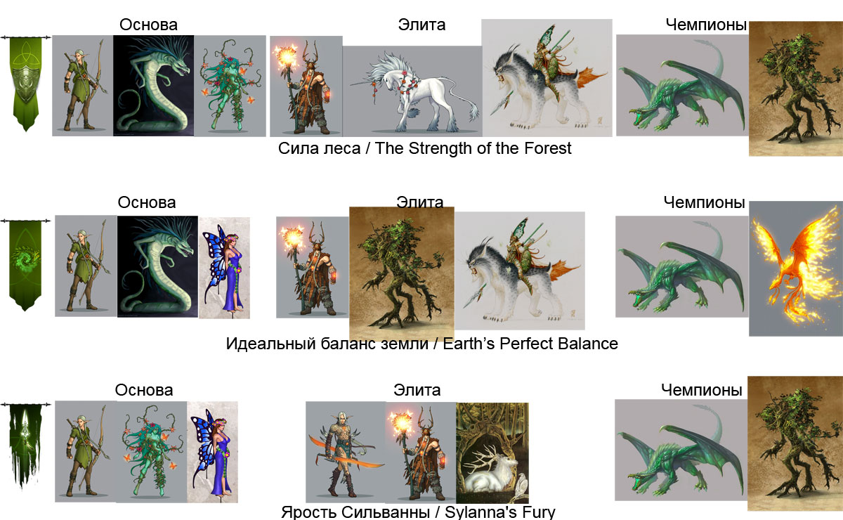 Для наглядности накидал по быстрому из того, что было под рукой линейки Сильвана, если у кого-то будут более подходящие картинки - выкладывайте. Sylvan line-up.jpg Честно говоря, ни один из предложенных вариантов меня не устроил на 100%, но тем не менее я остановился на первом, т.к. только там есть каноничный лично для меня юнит эльфов - единорог, а остальные не вызывают особой критики.