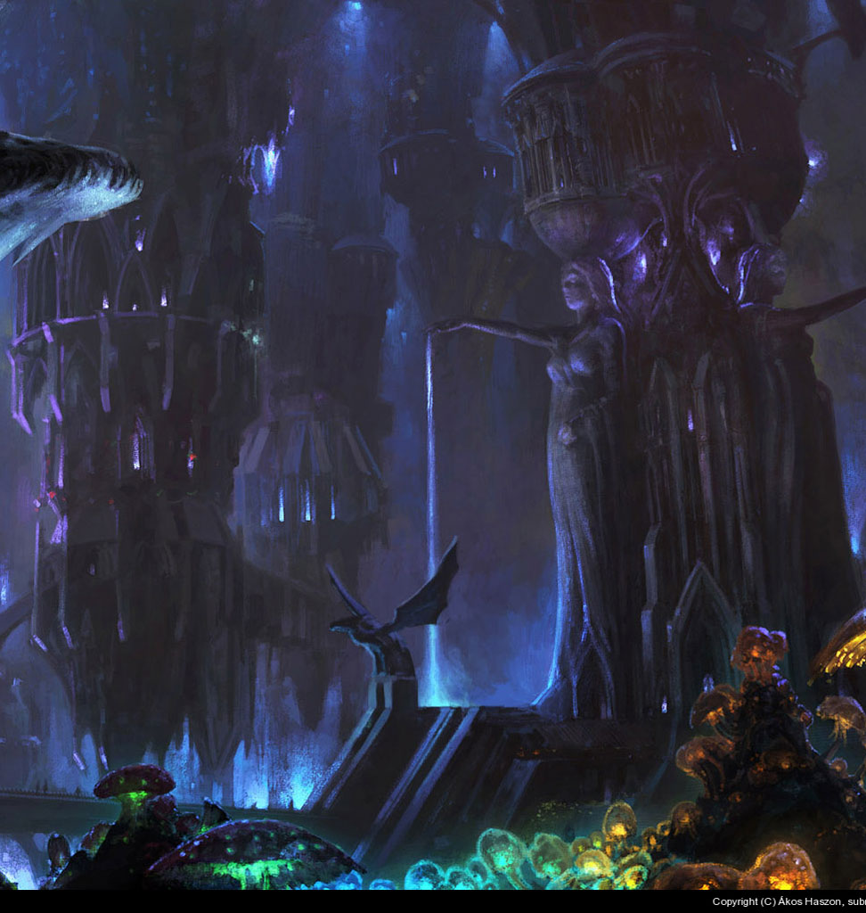 Никто, даже сами темные эльфы не знают всех тварей, что обитают в пещерах. Растительная жизнь редка – обычно это обширные грибные леса и прочие грибки и плесень. Темные эльфы разводят их, используя для всего, от средства озарения, до пищи и топлива. Все их города освещены мягким светом биолюминесцентных грибов, с синими и жёлтыми оттенками редких видов тут и там. Ничто не пропадает зря в тоннелях, и умершие темные эльфы идут на компост для грибов.